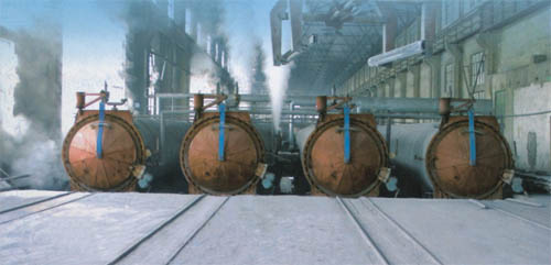 加氣混凝土可以根據原材料類別、品質、設備的工藝特征等,采用不同的工藝進行生產。一般情況下,將粉煤灰或硅砂、礦渣加水磨成漿料,加粉狀石灰、適量水泥、石膏和發泡劑、穩泡劑經攪拌注入模框內,靜養發泡固化后,切割成各種規格砌塊或板材,由蒸養車送入蒸壓釜內,經高溫高壓蒸氣養護形成多孔輕質的混凝土制品。